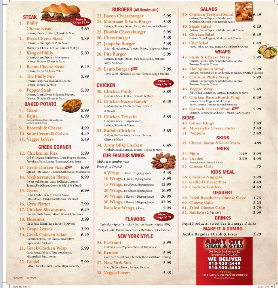 Introducing Army City Steak & Gyro, a delightful fusion of Greek and New American cuisine located in Fayetteville, NC. This eatery is well-known for its extensive menu that includes mouth-watering lamb gyros, juicy burgers, and loaded cheese fries. Customers rave about the freshness of the meals, as everything is cooked to order. The casual atmosphere, complemented by outdoor seating and a friendly staff, makes it a perfect spot for families and groups alike.